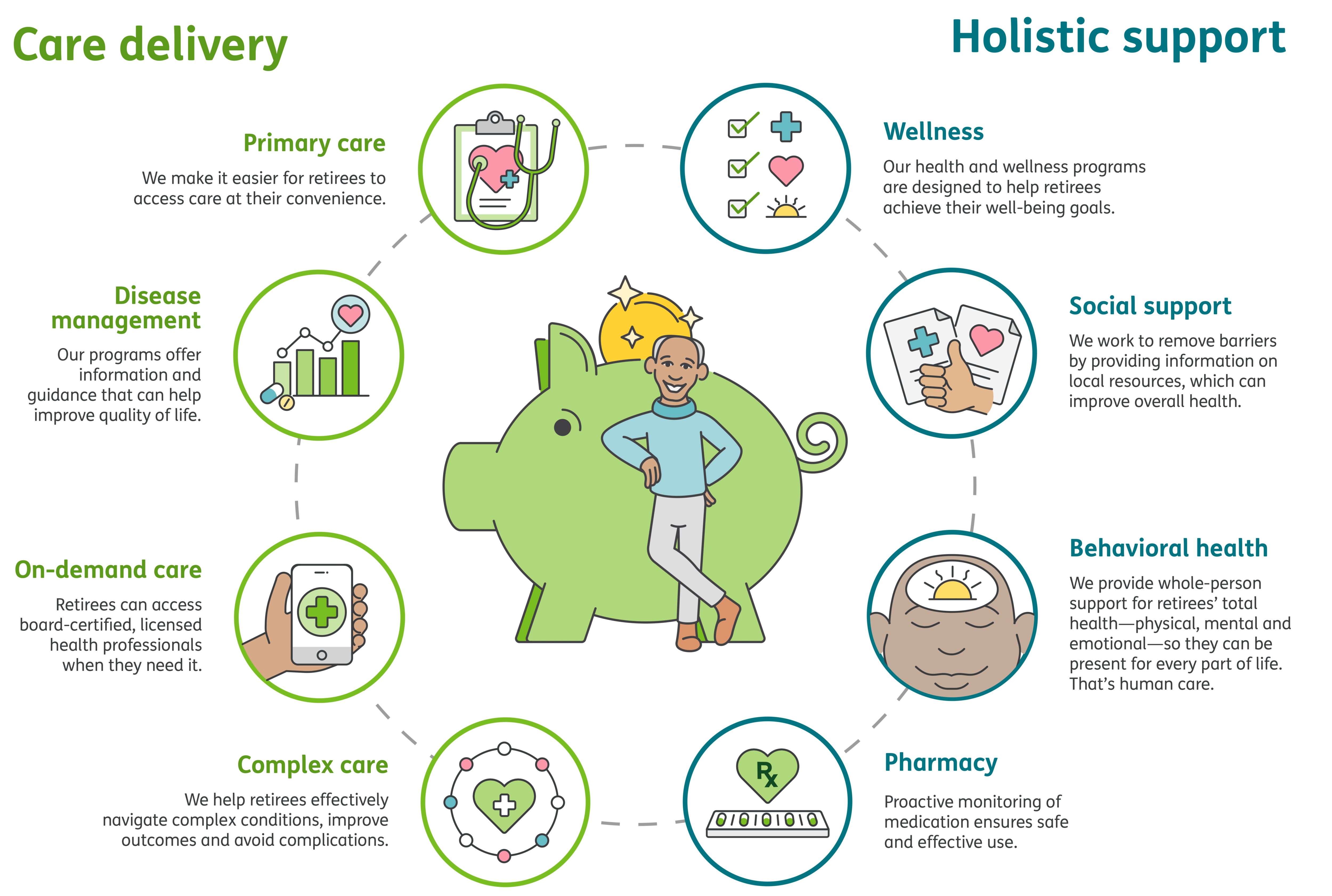 Humana offers whole person care to our retirees. This approach focuses on healthcare needs while also addressing the physical, behavioral, cognitive, social and financial needs of the retiree.